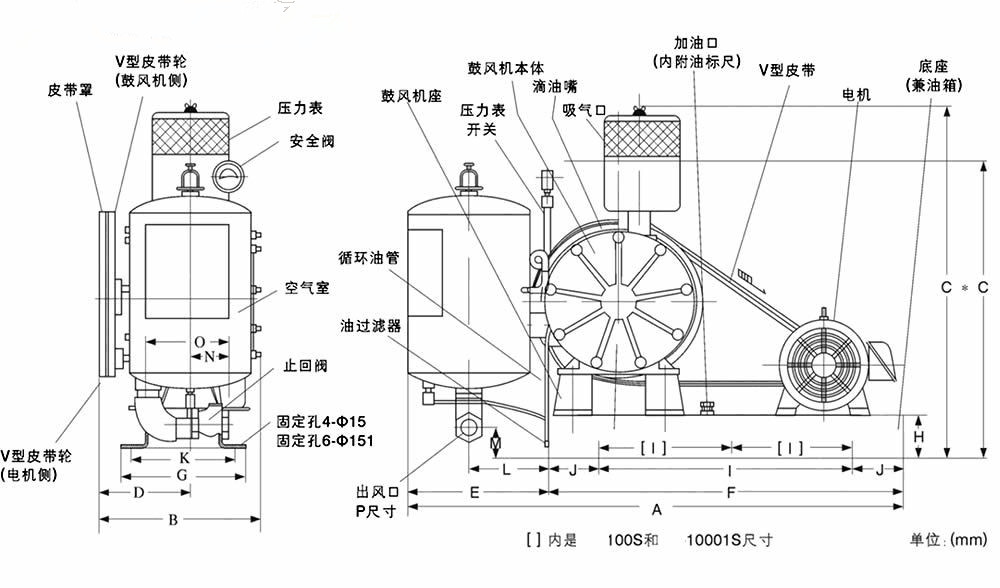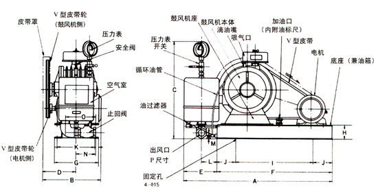 回轉(zhuǎn)式風(fēng)機主要有電機、空氣過濾器、鼓風(fēng)機本體、空氣室、底座(兼油箱)、滴油嘴六大部件。